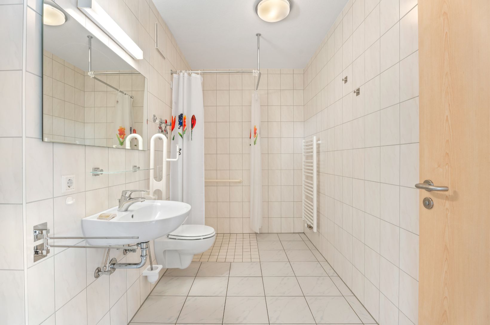 Das Badezimmer der Wohnung ist mit einer barrierefreien Dusche und einer praktischen Handtuchheizung ausgestattet; zudem findet sich Platz für eine Waschmaschine. Der zur Stadt ausgerichtete Balkon ist dank seiner Größe und Überdachung vielseitig nutzbar und schafft angenehme Außenbereiche. Ein Aufzug ermöglicht einen bequemen, durchgehend barrierefreien Zugang zur Wohnung und sorgt für Komfort in jeder Lebenssituation.