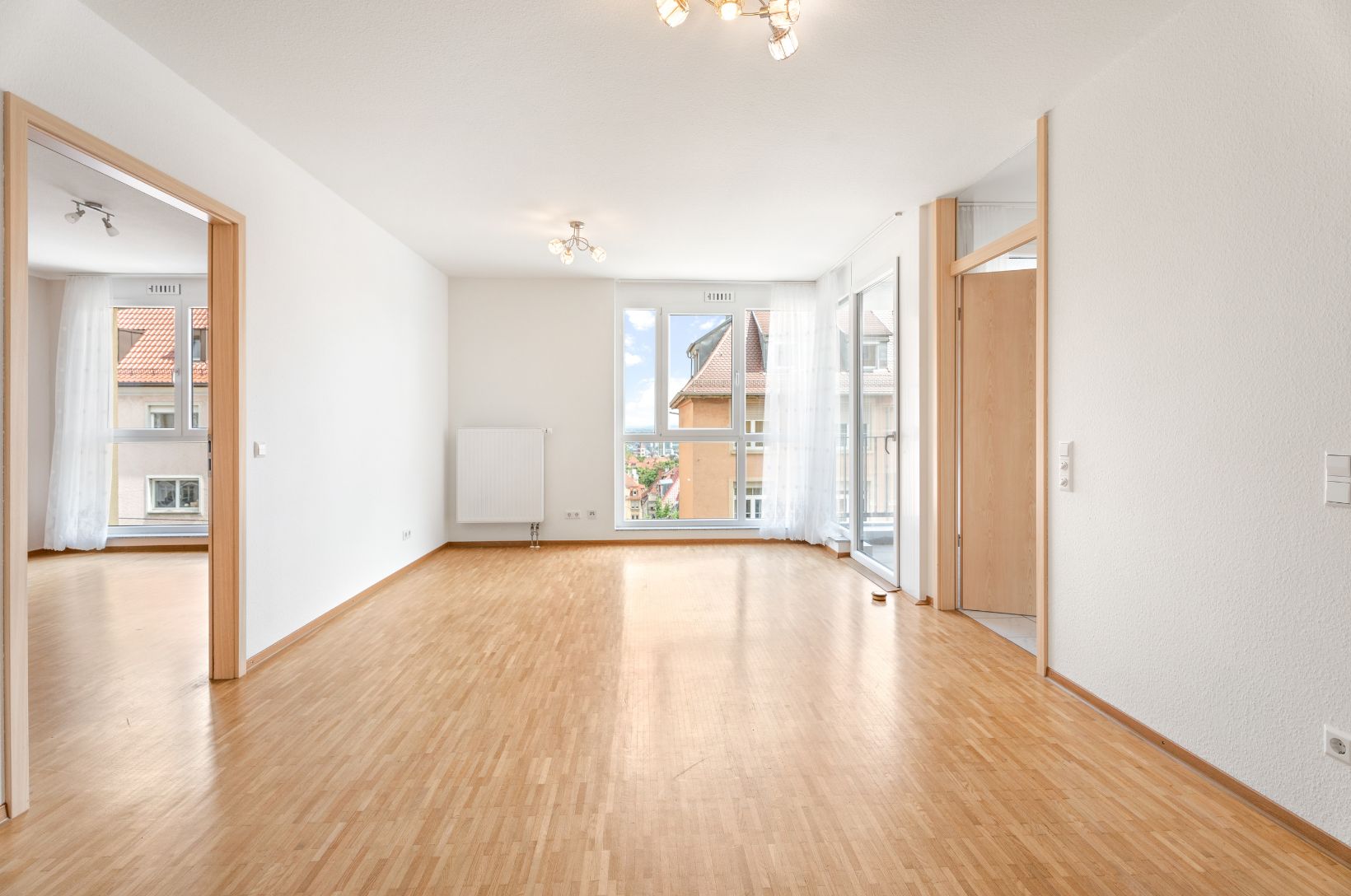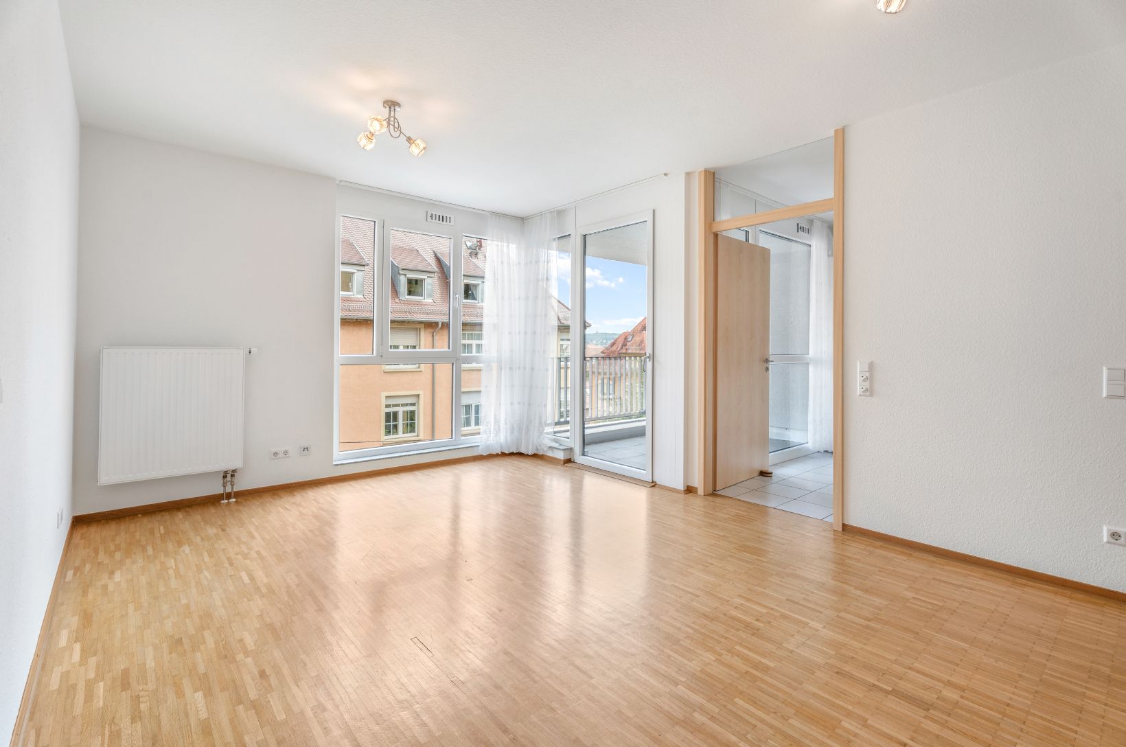 Große Fensterflächen und ein sonniger Balkon verleihen der Wohnung eine helle und freundliche Atmosphäre.